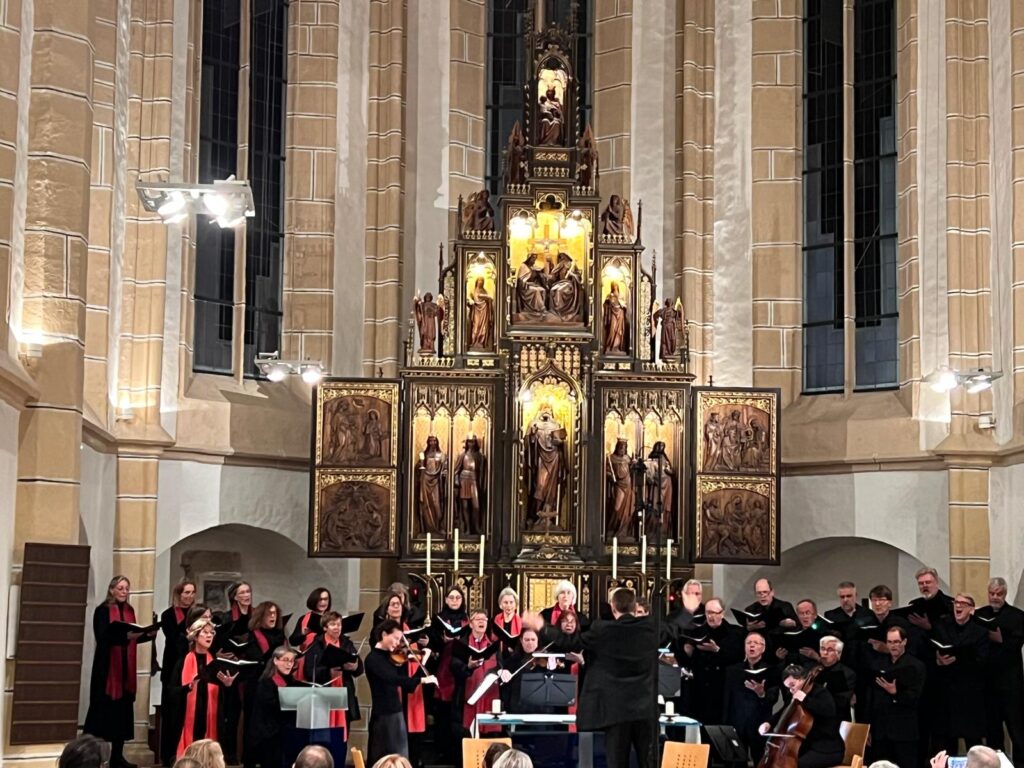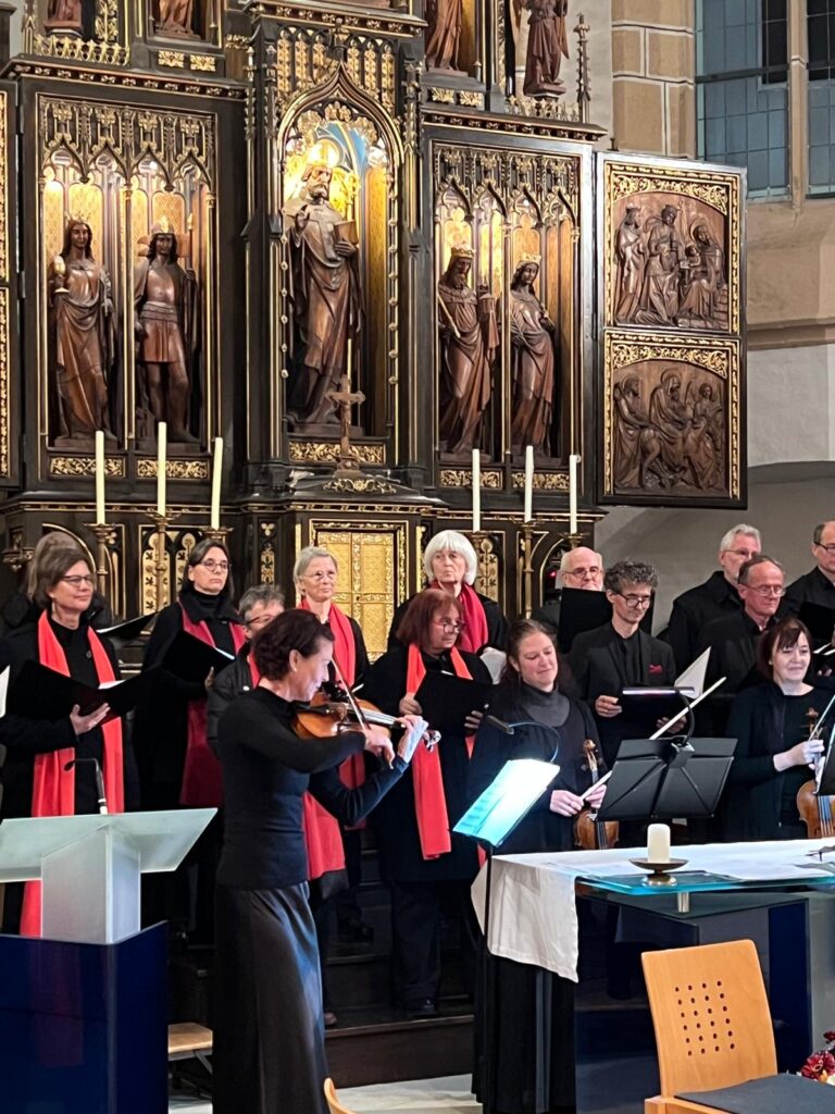 Der schlichte gotische Kirchenraum wurde zum vielseitigen Klangerlebnis: Vom Altarraum, der Orgelempore und dem Kirchenschiff erklang ein Programm, das auf den spannenden Gegensätzen von vokal und instrumental, Morgen und Abend, Krieg und Frieden, Anfang und Ende beruhte.